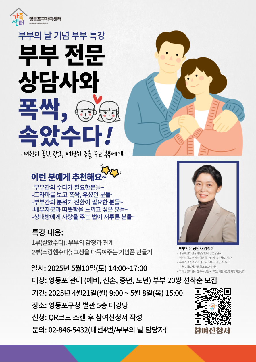 예비 부부부터 노년 부부까지, 영등포구에 거주하는 다양한 세대의 부부 20쌍(총 40명)을 선착순 모집하며, 5월 8일 오후 3시까지 안내문 속 정보무늬(QR코드)를 통해 신청서를 제출하면 된다. 자세한 사항은 구청 영등포구 가족센터 또는 아동청소년과로 문의하면 된다.