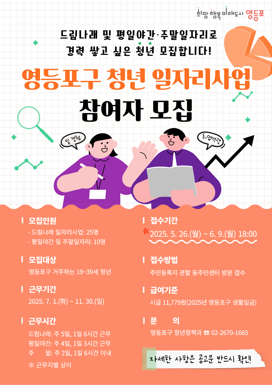 영등포구(구청장 최호권)가 청년들에게 실무 경험과 경제적 자립의 기회를 제공하기 위해 ‘청년 드림나래’ 및 ‘평일 야간‧주말 공공일자리’ 사업을 동시 운영하고, 오는 6월 9일까지 참여자를 모집한다고 밝혔다.