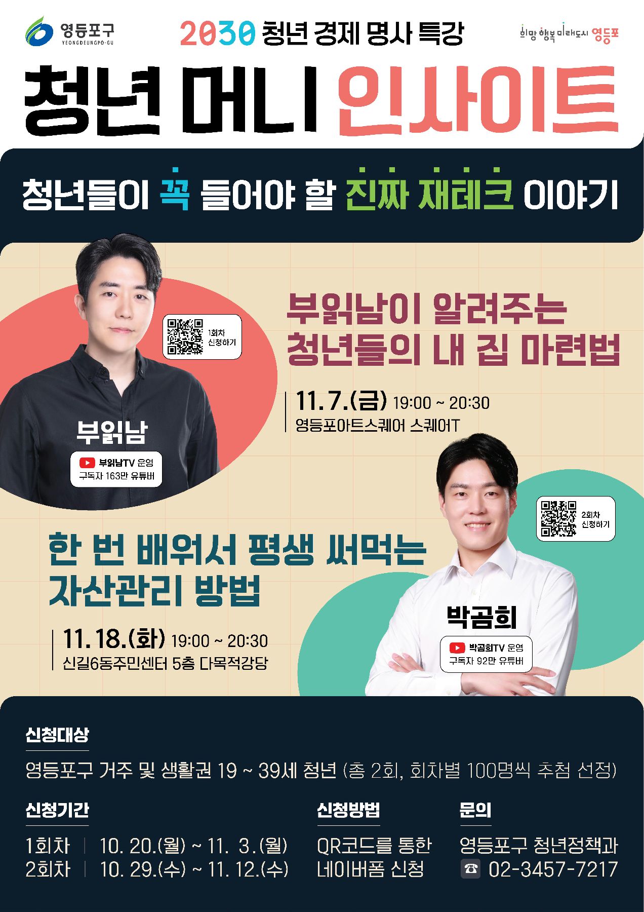 이번 특강은 청년들에게 관심이 높은 ‘부동산’과 ‘금융자산 관리’를 주제로 구성됐다. 실용적인 경제 지식을 쉽게 전하기 위해 인기 경제 유튜버 ‘부읽남’과 ‘박곰희’가 강연자로 나선다. 두 강사는 각각 구독자 163만 명, 93만 명을 보유하고 있으며, 복잡한 경제 개념을 알기 쉽게 풀어내 청년층의 높은 호응을 얻고 있다.