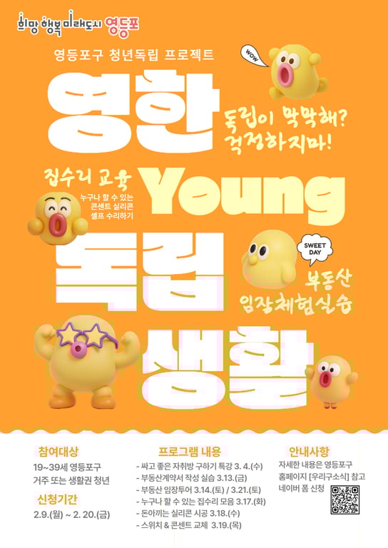 영등포구(구청장 최호권)가 청년 독립 지원 프로그램 ‘영(Young)한 독립생활’ 참여자를 2월 9일부터 20일까지 모집한다고 밝혔다.