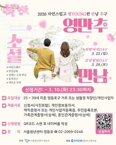 ‘영만추’는 청년 간담회에서 제시된 의견을 반영해 기획된 프로그램이다. 자연스럽고 젊은(Young) 만남의 기회를 제공해 청년들이 부담 없이 교류하며 지역 안에서 건강한 사회관계망을 형성할 수 있도록 돕는다. 이번 행사는 서울청년센터 영등포가 주최하고, 우리은행 영등포구청지점이 후원한다.