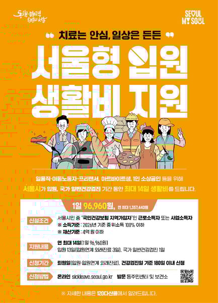 신청은 ‘서울형 입원 생활비 지원’ 누리집을 통해 온라인으로 가능하며, 거주지 관할 동 주민센터 또는 구 보건소 방문 신청도 가능하다. 신청 기한은 퇴원일 또는 건강검진일로부터 180일 이내다. 자세한 사항은 구 보건소 누리집 ‘사업안내-의료비 지원사업’ 게시판에서 확인할 수 있다.